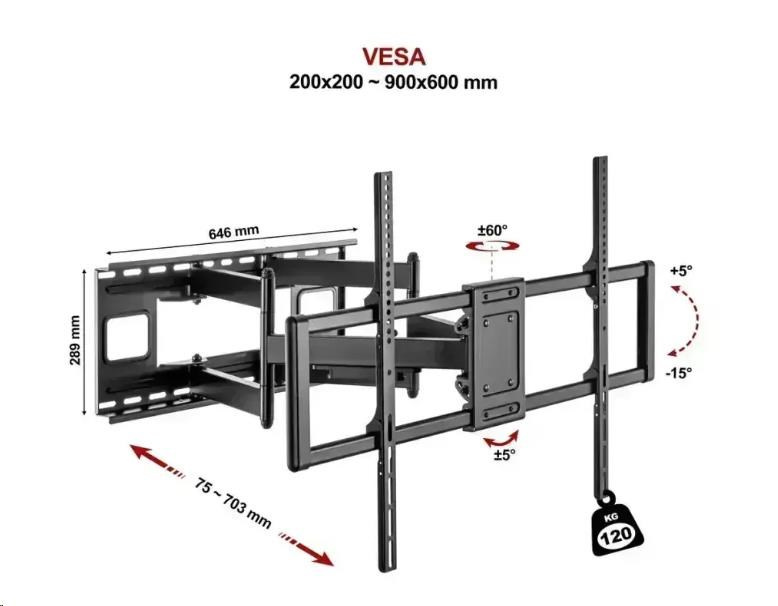 Super pevný TV držák Fiber Novelty MEGA120 Držák na TV 55" - 120", otočný +60° / -60°, sklopný +5° / -15°, vzdálenost od zdi 75 - 703mm, korekce roviny +5° / -5°, instalační materiál, šablona i minivodováha, VESA standardy 200x200 až 900x600, nosnost 120kg Představujeme Fiber Novelty MEGA120, revoluční držák na televize, který přináší nevídanou flexibilitu a bezpečnost pro vaši domácí zábavu. S možností instalace televizorů od 55" až do neuvěřitelných 120", tento držák je navržen tak, aby vyhovoval široké škále potřeb a preferencí. Jeho robustní konstrukce zajišťuje, že váš televizor bude v bezpečí a stabilní, zatímco unikátní otočný a sklopný mechanismus nabízí široké možnosti pro nastavení optimálního pozorovacího úhlu. MEGA120 držák na televize s nosností 120kg a VESA 200x200 až 900x600 Fiber Novelty MEGA120 je vyroben s ohledem na nejvyšší standardy kvality a pečlivě vybraný instalační materiál zaručuje snadnou a rychlou instalaci. Díky širokému rozsahu VESA kompatibility od 200x200 až po 900x600 je tento držák ideální volbou pro téměř každý televizor na trhu. Navíc s nosností až 120kg můžete být jisti, že váš televizor je v bezpečí. Využijte plný potenciál vašeho televizoru s Fiber Novelty MEGA120 a transformujte svůj obývací pokoj na ultimátní centrum domácí zábavy. Ať už sledujete svůj oblíbený film, děti si užívají kreslené, nebo hostíte sportovní večer s přáteli, tento držák se postará o nezapomenutelný zážitek pro všechny. Profesionální extrémně pevný držák na velké televize MEGA120 Technické údaje: nosnost 120 kg na televize, monitory a displeje s úhlopříčkou 55" - 120" podporované VESA standardy 200x200 až 900x600 nastavení vzdálenosti od zdi 75 - 703mm otáčení do stran až +60° / -60° naklápění obrazovky +5° / -15° korekce roviny +5° / -5° vynikající extrémně pevná konstrukce úchytky na kabely instalační materiál a šablona, minivodováha hmotnost samotného držáku (bez Tv) cca. 15kg barevné provedení černé záruka 3 roky Nastavitelná vzdálenost od zdi od 75 do 703 mm na držáku TV MEGA120 Držák Tv MEGA120 podporuje tyto VESA standardy: VESA 200x200 VESA 300x200 a 200x300 VESA 300x300 VESA 400x200 a 200x400 VESA 400x300 a 300x400 VESA 400x400 VESA 600x400 a 400x600 VESA 600x600 VESA 800x400 VESA 800x600 VESA 900x500 VESA 900x600.
