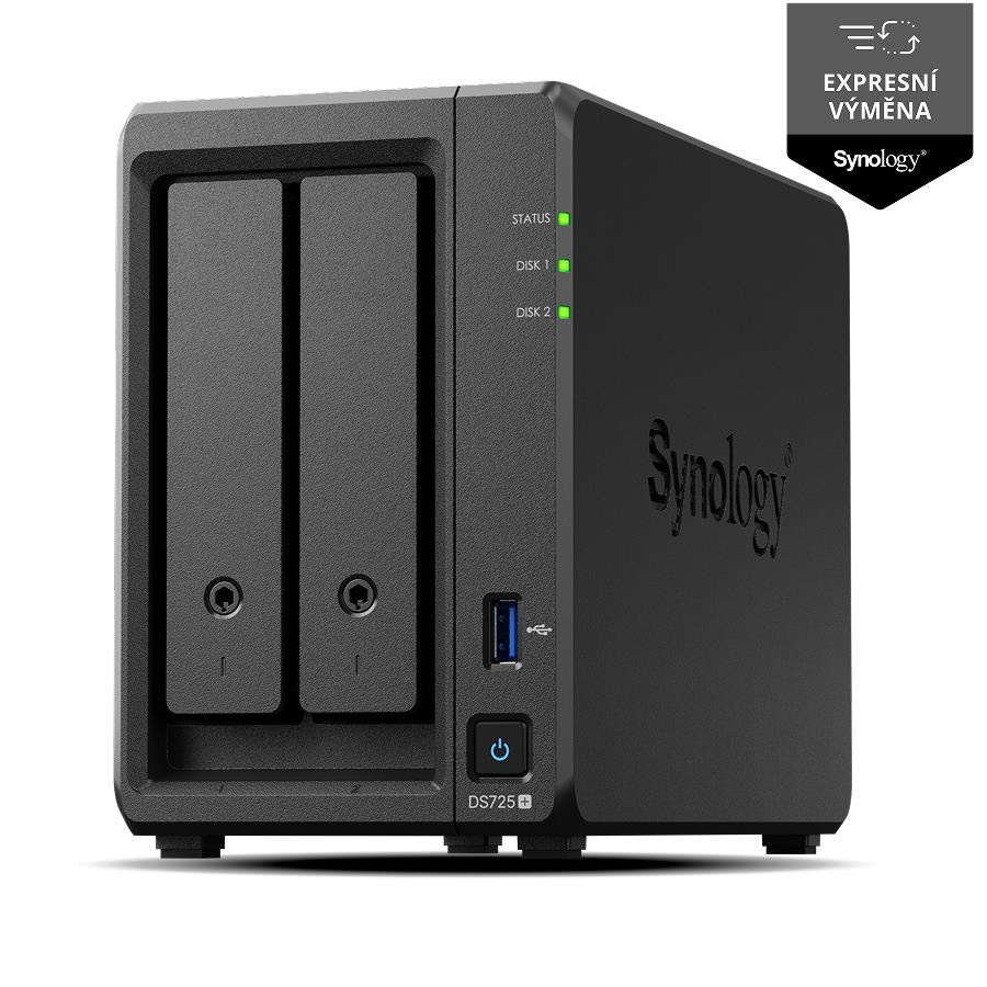 DS725+ nabízí vestavěné 2.5GbE připojení a podporuje jak SATA SSD, tak HDD v interních pozicích 2.5"/3.5", stejně jako M.2 NVMe disky přes M.2 sloty pro použití jako cache.