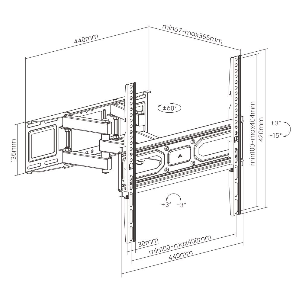 Držák na Tv 30-70", VESA 100x100 až 400x400, otáčení do stran +/-60°, naklápění +3°/-15°, korekce roviny +/-3°, vzdálenost Tv od zdi 67-355mm, pevná a spolehlivá konstrukce s nosností 40kg.Více