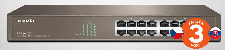 Popis Tenda TEG1016D 16-port Gigabit Ethernet Switch, 10/100/1000 Mbps, fanless, rackmount