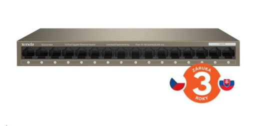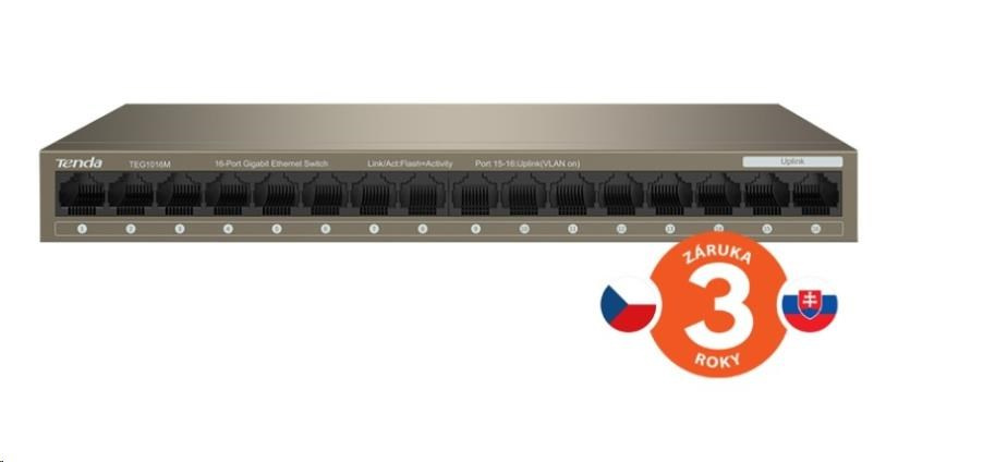 - Obsah balení: 1x Tenda TEG1016M, 1x Stručná instalační příručka (CZ, SK, PL), 1x Napájecí adaptér (12V DC, 1000 mA)