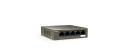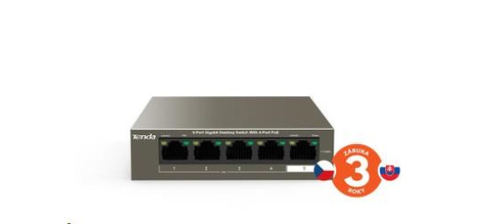 Tenda TEG1005P-4-63W přepíná data pomocí 5ti portů RJ45 s přenosovou rychlostí 10/100/1000 Mb/s s automatickou detekcí rychlosti. Jeden port slouží pro Uplink a 4 PoE porty podporují PoE 802.3af a 802.3at. Switch podporuje stabilní 8 jádrové PoE napájení, ochrana proti přepětí 6kV. Podpora přepojování uzlů v módu Store-and-Forward. Full-duplex kontrola toku 802.3x, half-duplex kontrola toku v režimu Back-Pressure.