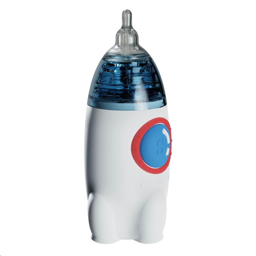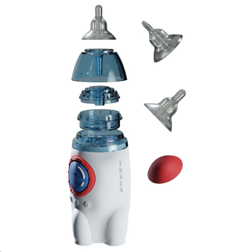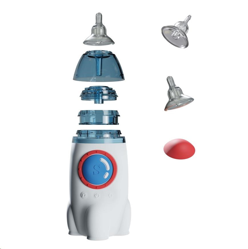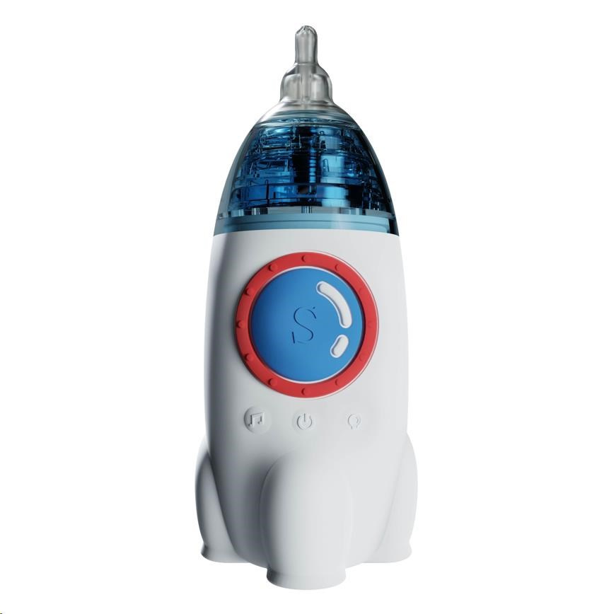 Byť je odsátí s TESLA Nasal Aspirator NA300 jemné a bezpečné, bude zřejmě i tak nutné dítě rozptýlit. Pozornost upoutá barevné světlo procházející přes modrého prstenec přístroje nebo deset melodií. Zaujme však i svým designem. Vypadá jako vesmírná raketa, a tak ji ani nemusíte po každém použití schovávat zpět do lékárničky. Zůstane-li na poličce vedle postýlky, stane se atraktivním doplňkem dětského pokojíčku.