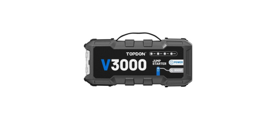 Startovací zdroj TOPDON V3000 je výkonově silný startovací booster a powerbanka v jednom je navržen pro náročné podmínky a vozidla s 12 V systémem (osobní auta, SUV, pick-upy, menší nákladní vozidla). Disponuje špičkovým proudem až 3000 A, díky čemuž spolehlivě nastartuje benzínové motory až 9,0 l a naftové až 7,0 l.