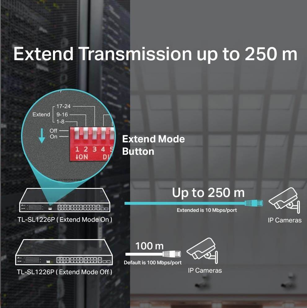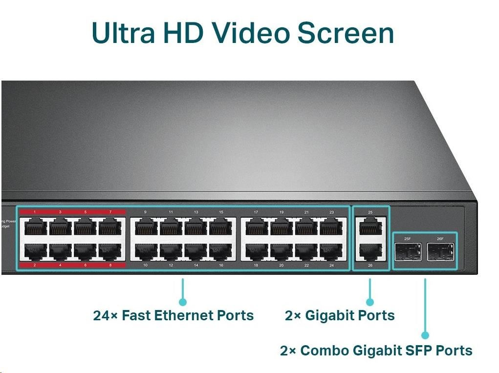 Vyhovuje standardu 802.3af/at PoE + a podporuje až 30 W napájení na každém PoE portu. Celkový výkon napájení až 250 W PoE pro 24× PoE porty, umožňuje široké spektrum aplikací, jako je dohled, kanceláře, koleje a malé podniky. Je plně kompatibilní s IP kamerami, přístupovými body, IP telefony, počítači, tiskárnami atd.