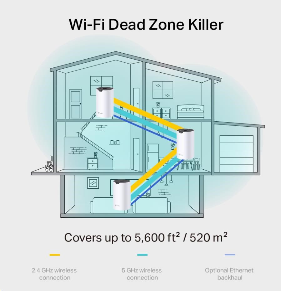 Optional Ethernet backhaul works together to link Deco units to provide seamless coverage