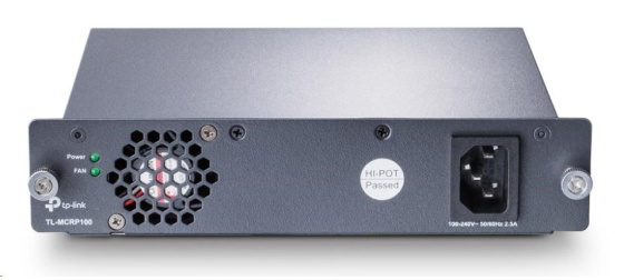 Modul redundantního napájecího zdroje TP-Link TL-MCRP100 je napájecí modul se střídavým vstupem a stejnosměrným výstupem. Dokáže převést vstupní napětí 100-240V 50/60Hz na výstupní 12VDC s jmenovitým výkonem 75W. Napájecí modul podporuje výstupní přepěťovou/zkratovou/nadproudovou ochranu. TL-MCRP100 je použitelný pro 14slotové šasi TL-MC1400.