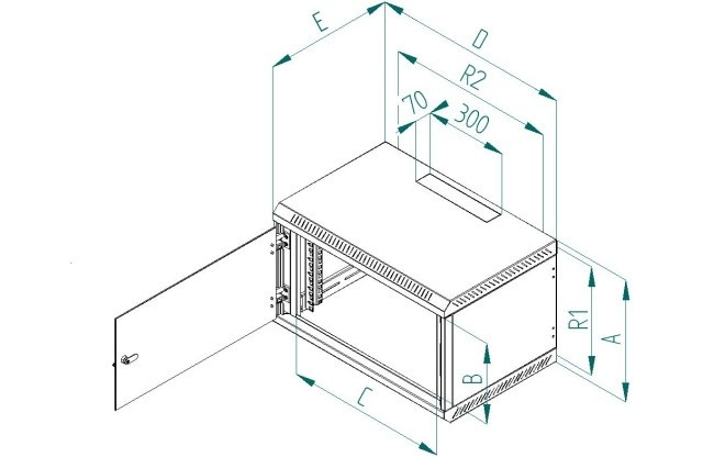 Rozvaděč Delta B je celosvařený nástěnný jednodílný rozvaděč s celoskleněnými dveřmi, které je možné díky masivním pantům otevřít pod úhlem téměř 180°. Důležitou součástí výrobku jsou otvory pro kabely, které jsou umístěny na horní a dolní stěně. Další dva otvory jsou umístěny na zadní stěně rozvaděče. Otvory jsou zaceleny vylamovacími záslepkami, které je možné vylomit s pomocí např. šroubováku. 19“ zařízení se instalují na vertikální lišty, které je možné plynule natavit podle potřeby do hloubky těla rozvaděče. Díky perforaci je zajištěna přirozená cirkulace vzduchu a chlazení komponentů. Přesné rozměry a další technické údaje jsou uvedeny níže (hodnoty R1 a R2 označují rozteče montážních otvorů pro zavěšení rozvaděče na zeď). Maximální zatížení rozvaděče je 30 kg. Rozměry: A – 370 mm B – 265 mm C – 490 mm D – 600 mm E – 395 mm R1 – 324 mm R2 – 420 mm Hmotnost – 14,8 kg Příbal: Klíč - přední dveře 2x Vrut 6x50 4x Podložka 6,6 4x Hmoždinka 10 4x Plastová podložka 8x Plovoucí matice M6 8x Šroub M6x16 8x Protiprachová záslepka 1x. Triton CZ s.r.o., Drahobejlova 1832/51, 190 00 Praha 9, Česká republika, obchod@triton.cz
