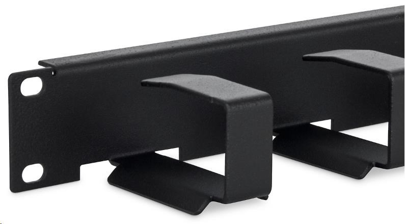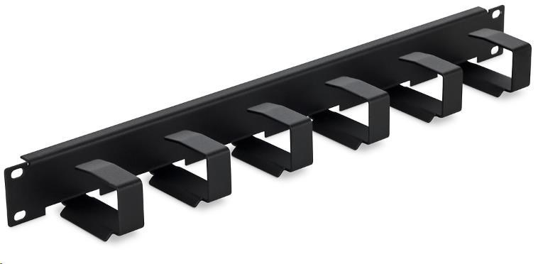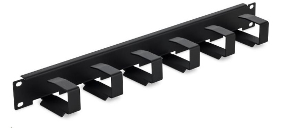 19" vyvazovací panel 1U, 6 x vyvazovací háček 70 x 27 mm s náběhem proti poškození optických vláken a kabelů.