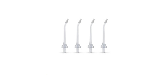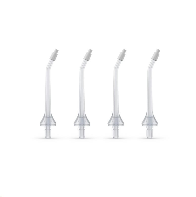 Ortodontická tryska pro odstraňování plaku ze zámečků a drátků rovnátek a dalších těžko dostupných míst.