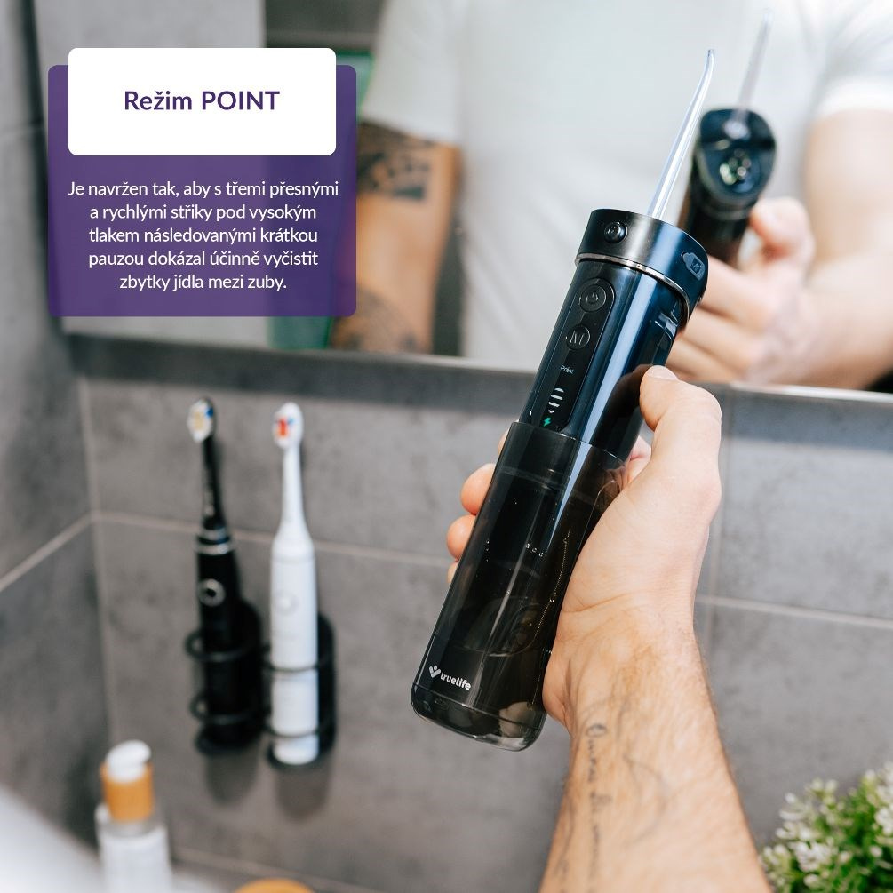Doslova rájem pro bakterie jsou v ústní dutině mezizubní prostory. Chránit zuby před zubním kazem můžeme důkladným čištěním i těchto těžko dostupných míst. Ústní sprcha TrueLife AquaFloss Mini M50 Black je praktickým a komfortním pomocníkem. Poskytuje maximálně efektivní řešení díky 3 režimům čištění se 4 intenzitami tlaku pro každý z nich a technologii StreamTrue®, která odstraní až 99 % plaku a nečistot. Technologie PulseTrue® příjemně masíruje dásně a přispívá k jejich regeneraci. Funkce paměť si zapamatuje poslední použitý režim. Sprcha je nově vybavena také jedinečnou tryskou Bubble Spraying s technologií, jež rozpráší vodu po celé ploše zubu. Nádržku o objemu 180 ml snadno naplníte 3 různými způsoby a hlavice otočná o 360° je zárukou, že se dostanete do každého zákoutí. Ústní sprcha je skvělá na doma, ale i na cesty díky teleskopickému tělu, koženkovému pouzdro, možnosti uschovat trysku v horní části sprchy a výdrži baterie 12 dní.