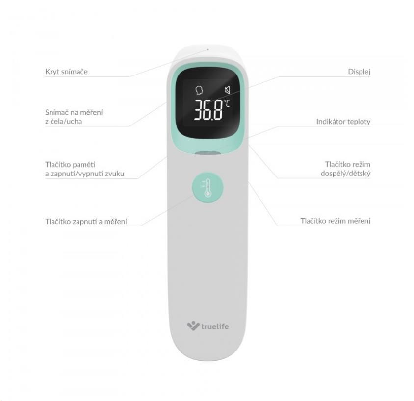 TrueLife Care Q10 BT nabízí tři režimy měření teploty. Kromě klasického měření tělesné teploty dokáže změřit i předměty, povrchy, nebo tekutiny. Snadno tak můžete zkontrolovat třeba kojeneckou stravu nebo čaj. U měření tělesné teploty osob máte možnost volby mezi měřením z teploty z ucha, nebo čela. Teploměr disponuje i dětským režimem, který je uzpůsoben pro osoby mladší 12 let.