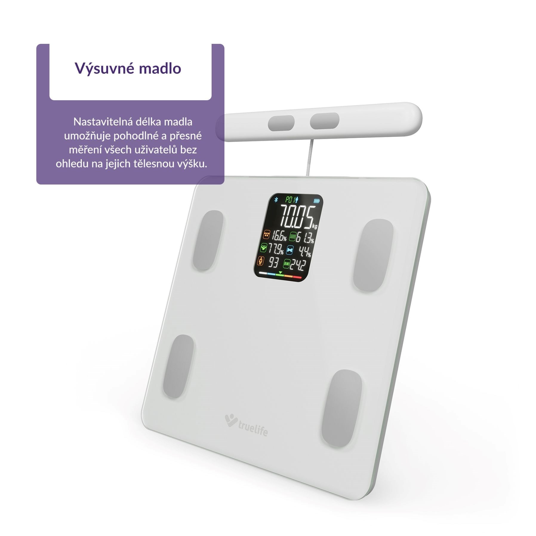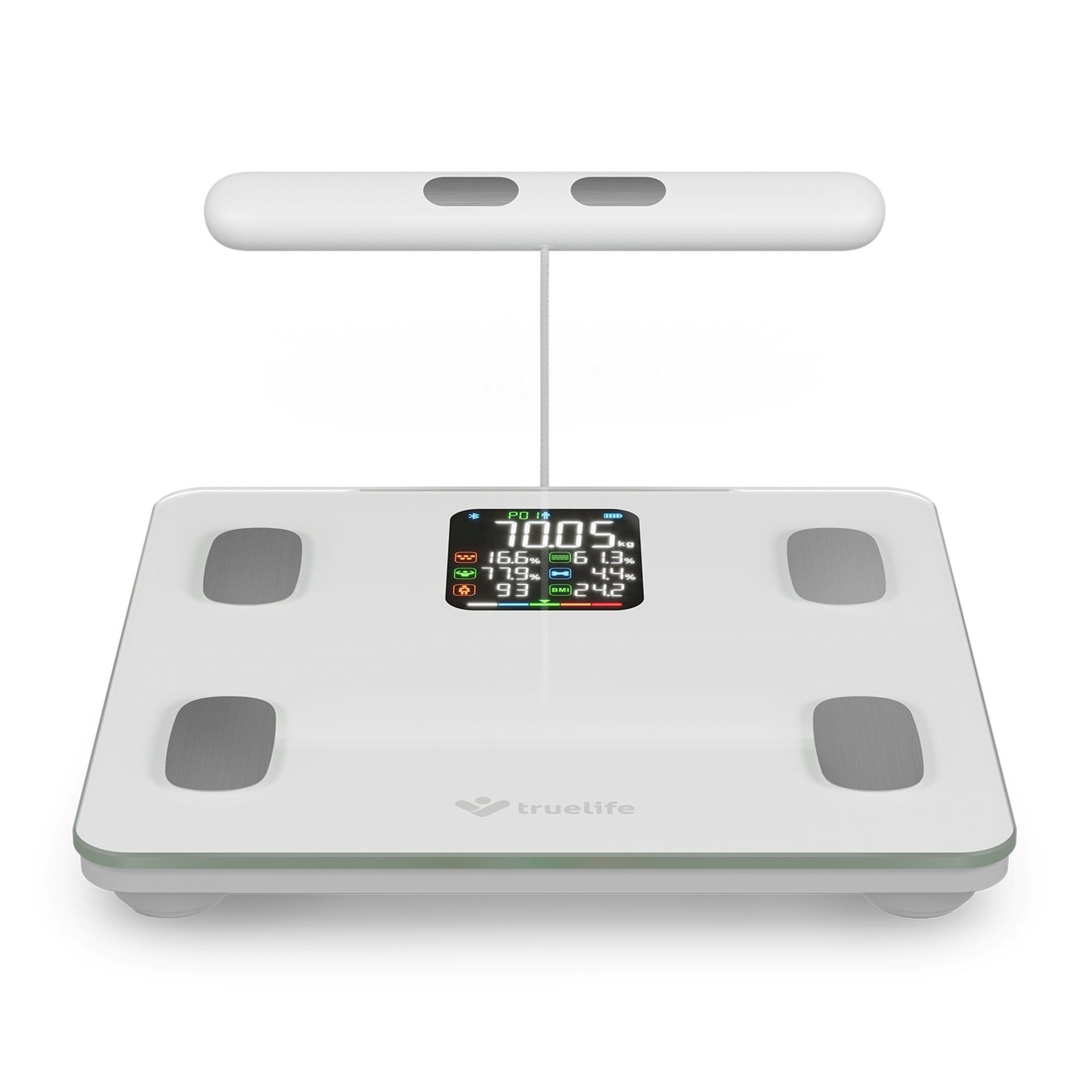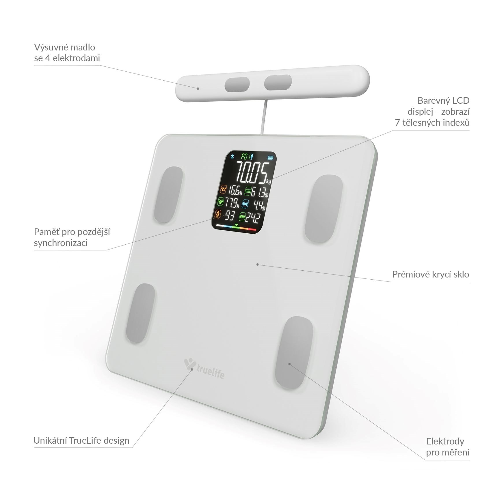 Zjistěte o svém těle více než jen pouhou hmotnost. Každý jsme originál a jedinečnou skladbu má i naše tělo, proto o něm chytrá váha TrueLife FitScale W8 BT White prozradí detaily. Technologie TrueLife PrecisionIQ+® využívá 8 vysoce citlivých senzorů a s pomocí bioelektrické impedanční analýzy změří celkovou tělesnou kompozici. Na přehledném barevném LCD displeji zobrazí celkem 7 údajů - kromě hmotnosti také třeba procento tuku, svalů či vody. Propojením přes Bluetooth s aplikací získáte přehledný report zahrnující 15 tělesných indexů včetně jejich popisu. Váha je schopna sledovat až 16 uživatelů, u kterých v aplikaci zaznamená 15 posledních měření. Každého uživatele automaticky rozezná, takže není třeba nic přepínat. Kdokoliv má však možnost použít váhu i bez aplikace. Prémiové tvrzené krycí sklo je elegantní a velmi odolné s nosností až 180 kg. Při vážení si můžete zvolit jednotky, a to buď kilogramy nebo libry. Vážící odchylka činí pouhých 0,1 kg, takže vaše výsledky budou opravdu přesné.