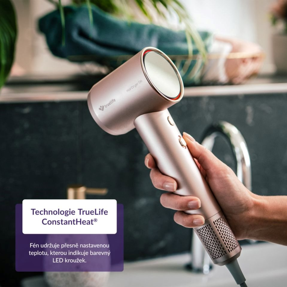 Dopřejte svým vlasům tu nejlepší péči, fén s ionizátorem TrueLife HairDryer D6 jim poskytne profesionální ošetření v pohodlí vašeho domova. Jeho super rychlý motor s technologií TrueLife UltraFlow® se pyšní výkonem až 110 000 otáček za minutu. Ionizátor s technologií TrueLife UltraIonic® generuje okolo 200 milionů záporných iontů, které pomáhají k hladším a také zdravějším vlasům, vysoušení je totiž šetrnější a rychlejší. Aktuálně zvolenou teplotu indikuje barevný LED kroužek, přičemž na výběr máte ze 3 stupňů či módu pro střídání studeného a horkého vzduchu, rovněž lze zvolit ze 2 rychlostí vysoušení. Dokonalý styling podpoří přiložený magnetický koncentrační nástavec. Konec přesušeným a poškozeným vlasům díky technologii TrueLife ConstantHeat® během sušení nekolísá teplota. Fén pracuje velmi tiše, bezpečnost zajišťuje ochrana proti přehřátí a ani údržba vás nemusí trápit, odnímatelný prachový filtr snadno odšroubujete a vyčistíte.