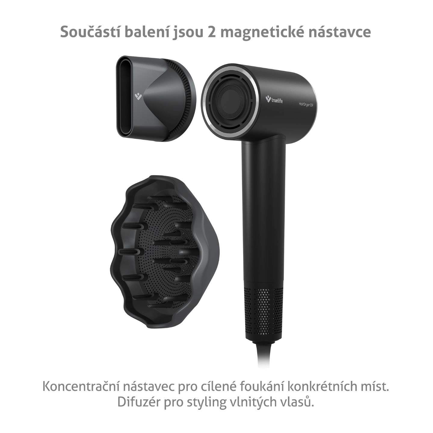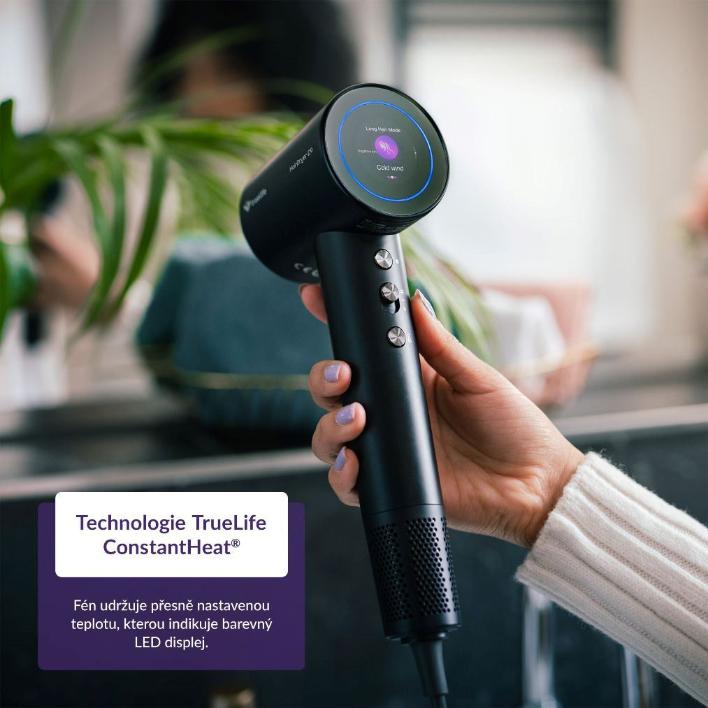 Vlasy jsou korunou krásy, proto jim dopřejte tu nejlepší péči jako ze salonu. Prémiový fén s ionizátorem TrueLife HairDryer D9 se o vaše vlasy postará doma i na cestách, a to s možností využití hned 5 různých módů včetně speciálního dětského. Aktuálně zvolený mód spolu s dalšími funkcemi zřetelně vidíte na barevném LED displeji. Motor fénu pracuje díky technologii TrueLife UltraFlow® rychlostí až 110 000 otáček za minutu a prostřednictvím ionizátoru s technologií TrueLife UltraIonic® dosáhnete perfektního účesu rychleji a za nižších teplot, takže vlasy zůstávají zdravější. Tři teplotní úrovně a dvě rychlostní jim poskytnou takovou péči, kterou potřebují. Balení fénu s velmi tichým chodem obsahuje také 2 magnetické nástavce. Údržbu přístroje usnadňuje magnetický prachový filtr.