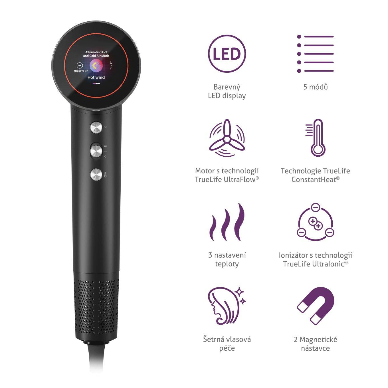TrueLife HairDryer D9 patří ke špičce ve své kategorii. Jeho ionizátor s technologií TrueLife UltraIonic® produkuje až 200 milionů záporných iontů a vlasy jsou tak hladší a zdravější. Vlhkost se z dlouhých a polodlouhých vlasů odpaří rychleji a za využití nižší teploty. Šetrnost a rychlost vysoušení je dána také motorem s technologií TrueLife UltraFlow®, který provádí až 110 000 otáček za minutu. Praktickým vybavením fénu je kulatý barevný LED displej přehledně zobrazující veškeré informace o foukání, tedy navolený mód, rychlost či ionizaci.