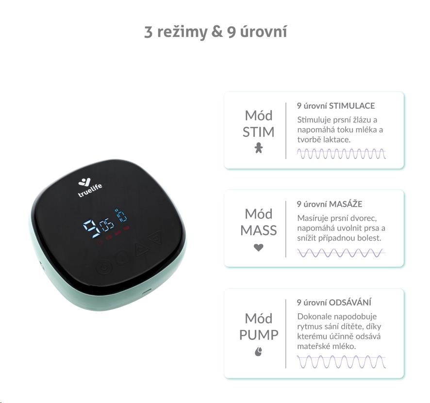Kromě odsávání můžete zvolit ještě mód stimulace, nebo masáže. U každého módu máte na výběr z devíti úrovní, takže si odsávačku nastavíte přesně tak, jak vám vyhovuje.