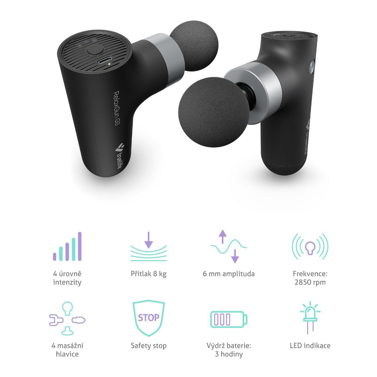 Ať už sportujete a potřebujete ulevit namoženým svalům, nebo máte sedavé zaměstnání a chcete napomoci zmírnit napětí a bolesti, masážní pistole TrueLife RelaxGun G3 je pro vás to pravé. V pohodlí domova vás namasíruje, a tím napomáhá regeneraci svalů, zlepšení průtoku krve a uvolnění křečí. Stačí zvolit jednu ze 4 vyměnitelných hlavic a nastavit některou ze 4 intenzit masáže. V malém lehkém těle, které dobře sedne do ruky, se ukrývá síla přítlaku 8 kg a frekvence pohybů až 2850 za minutu. Amplituda činí 6 mm. Bezpečné používání zajišťuje funkce Safety stop, která při přílišném tlaku přístroj zpomalí či vypne. Po 15 minutách používání pak dojde k automatickému vypnutí. Dobíjecí lithiová baterie zvládne až 3 hodiny provozu.