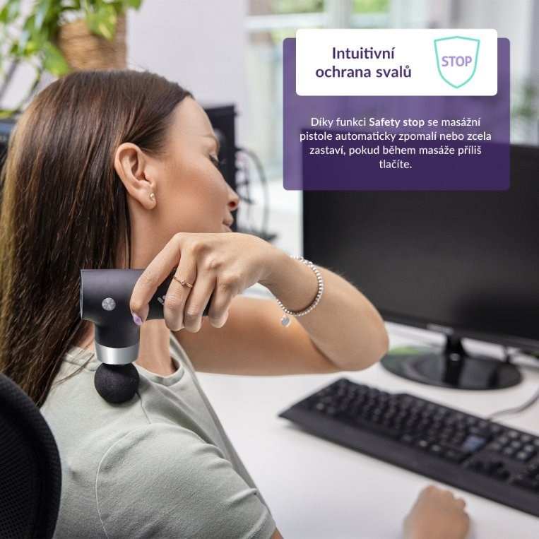 Aby nedošlo ke zranění, je masážní pistole vybavena funkcí Safety Stop, díky které automaticky zpomalí či úplně zastaví motor, pokud při masáži příliš přitlačíte. Přístroj se sám vypne po 15 minutách masáže. Ovládání je velice intuitivní a jednoduché, protože vám k použití postačí pouze jedno tlačítko.