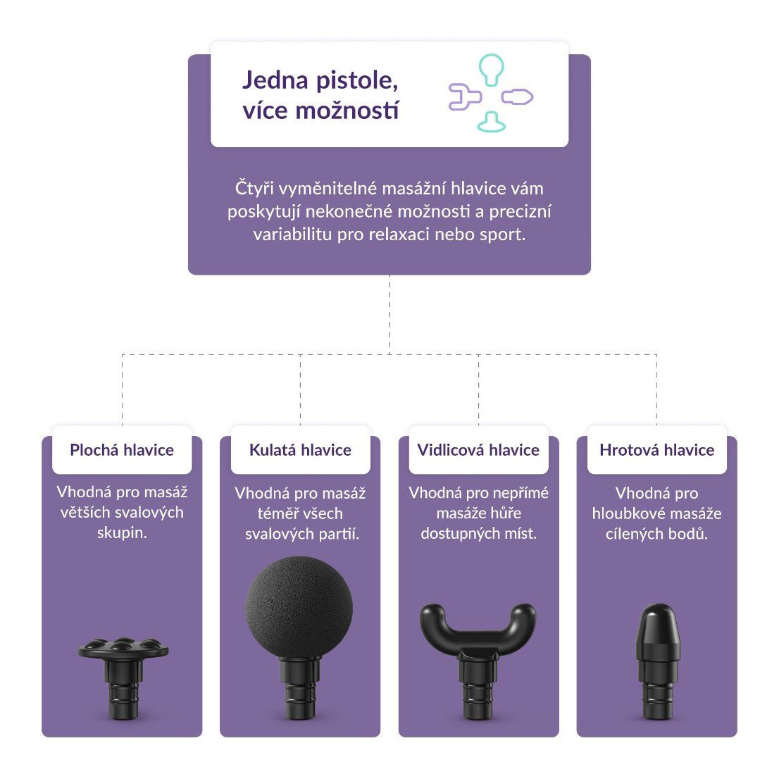 Masážní pistole je vybavena čtyřmi masážními hlavicemi pro různé typy masáží.