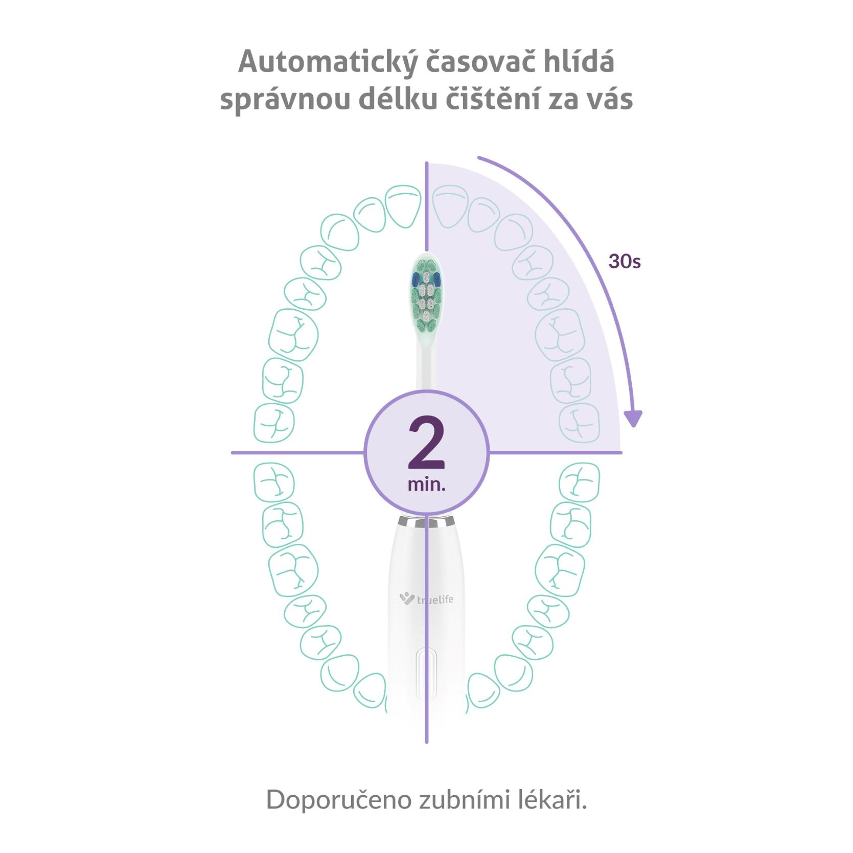 Sonické kartáčky TrueLife SonicBrush Clean30 obsažené v sadě disponují 5 režimy čištění, jež usnadňují každodenní péči o zuby a dásně. Běžné čištění obstará režim Clean, s odolnějším zubním plakem zatočí režim Whiten, který zároveň přispívá k bělení zubů. Dokonale zářivý úsměv zajistí režim Shine efektivně odstraňující pigmentové skvrny způsobené například kávou či čajem. Patříte-li k lidem s citlivějšími zuby a dásněmi, pak oceníte režim Sensitive. Ke zdravějším dásním přispěje režim Massage, a to jejich stimulací. Ideální doba čištění jsou 2 minuty, hlídat je ale nemusíte, časovač to obstará za vás. Také vždy po 30 sekundách upozorní, že je čas přesunout se na další část chrupu.