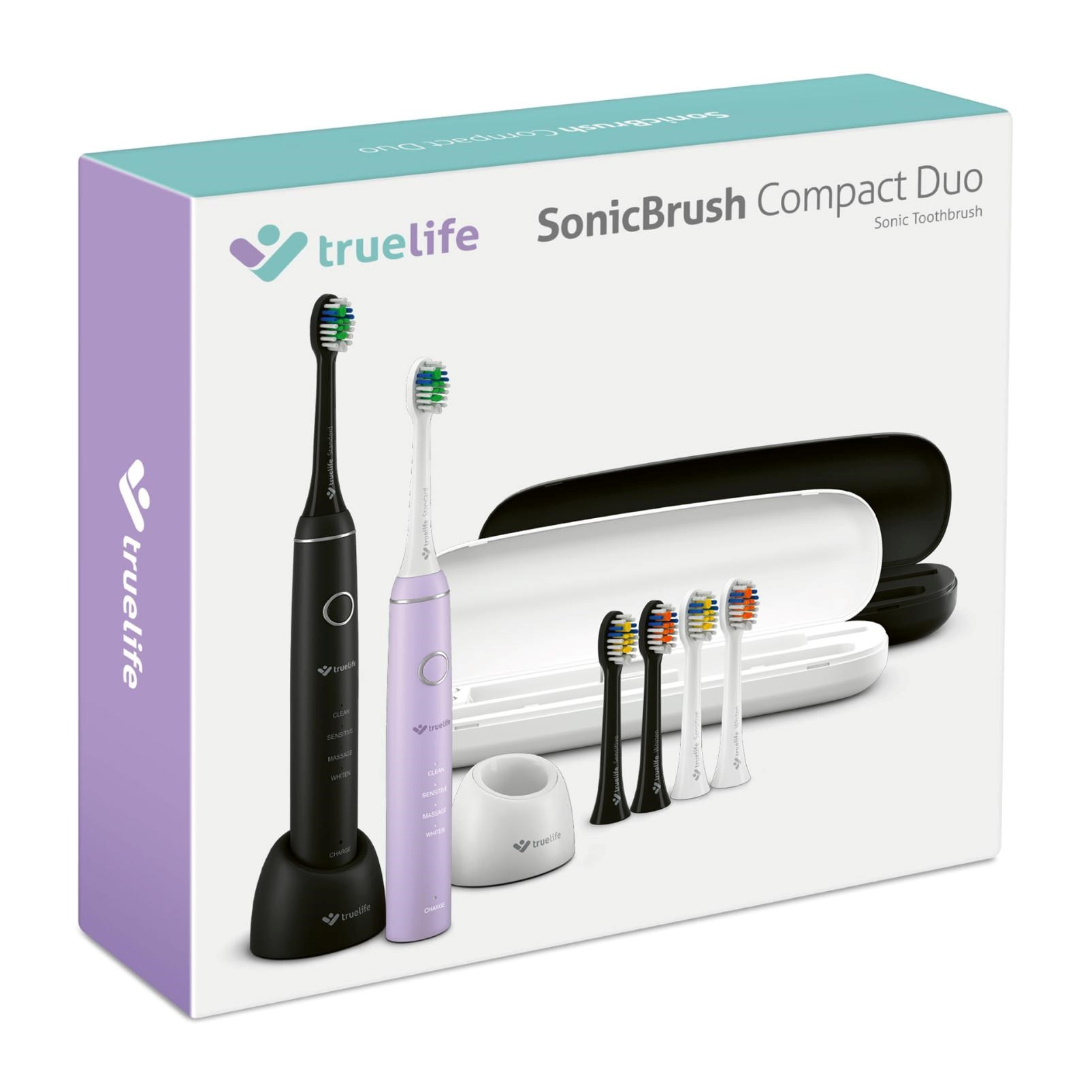 Chcete mít zdravé zuby a dásně? Nestresovat se z každé návštěvy zubaře? Na kartáček TrueLife SonicBrush Compact s moderní sonickou technologií SonicTrue® se můžete spolehnout vy i váš partner. V sadě SonicBrush Compact Duo totiž najdete dva sonické kartáčky, 6 náhradních hlavic (Sensitive, Standard, Whiten), 2 cestovní pouzdra a 2 dobíjecí základny. Dopřejte si i vy exkluzivní zubní péči, díky které získáte zářivý úsměv a nedáte šanci škodlivým bakteriím. Štětinky kartáčku kmitají vysokou rychlostí až 70 000 pohybů za minutu a každým pohybem odstraní maximum zubního plaku. Můžete vybírat ze 4 režimů čištění. Baterie kartáčku vydrží až 30 dní.