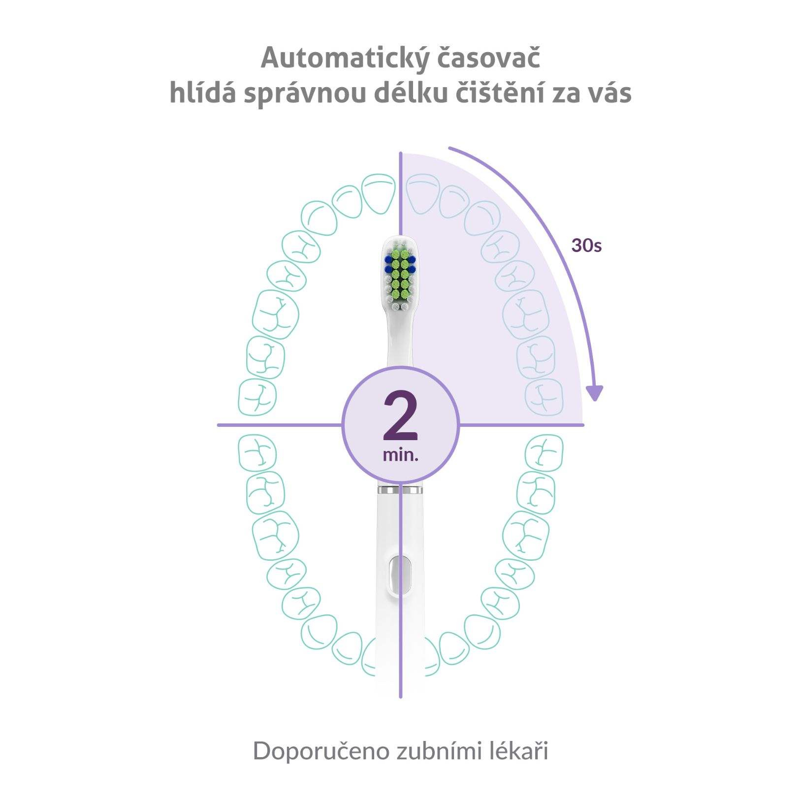 Kartáček je vybaven časovačem nastaveným na ideální 2 minuty čištění, poté se automaticky vypne.