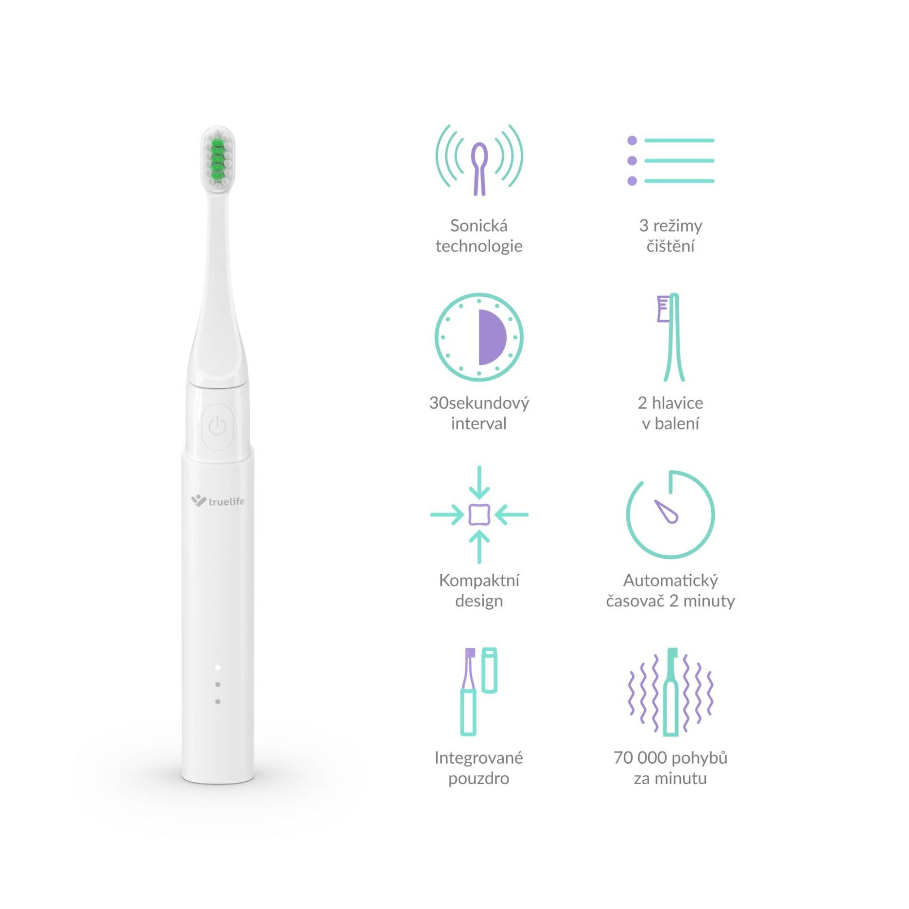 Hlavice kartáčků kmitá rychlostí 70 000 pohybů za minutu. Jemné vibrace nedají šanci zubnímu plaku, pigmentovým skvrnám, ani bakteriím. Sonická technologie SonicTrue® je oproti rotačním kartáčkům šetrnější k zubní sklovině. Kartáček zároveň víří pastu s vodou, vhání je do mezizubních prostor, a tím je pomáhá čistit.