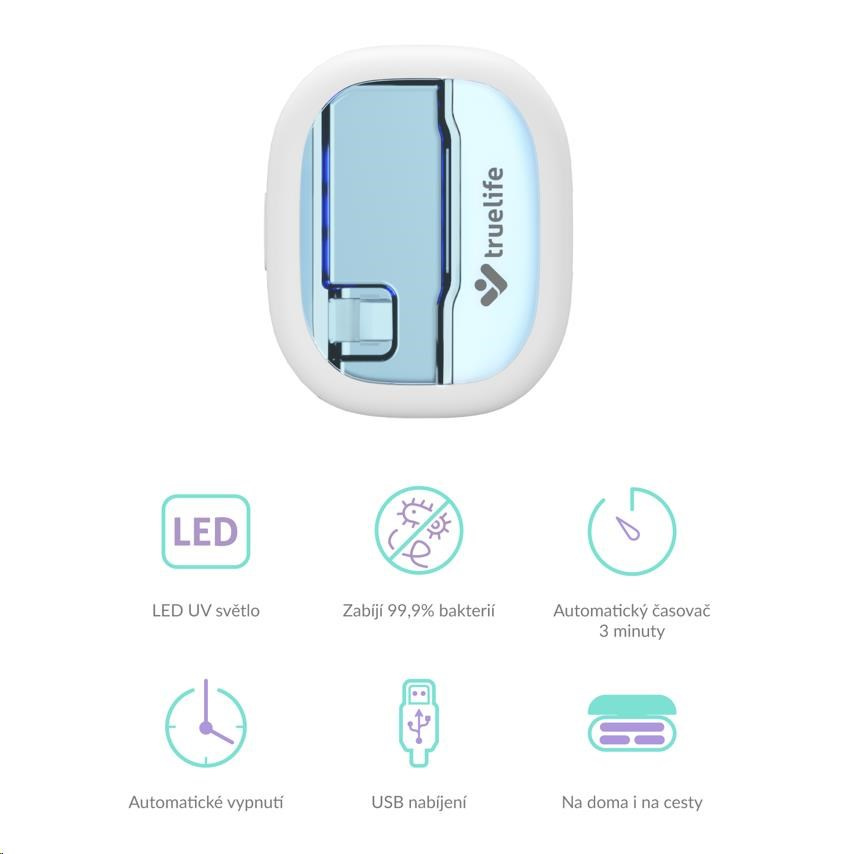 UV sterilizátor od TrueLife je malý přístroj, který efektivně ničí bakterie usazující se na hlavicích zubních kartáčků. Díky UV-C záření o vlnové délce 200-275 nm proniká k membránám bakterií, virů a plísní a zabraňuje jejich šíření. Je kompatibilní s většinou hlavic elektrických i manuálních kartáčků na trhu.