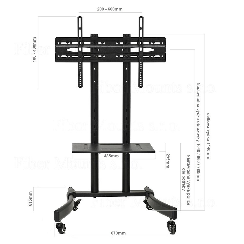 Podlahový stojan na Tv pojízdný Fiber Mounts M7C39 Podlahový pojízdný stojan na televize 32" až 65", nastavitelná výška televize 89/96/114cm, polička 485x295mm, pojízdný, VESA 200x100 až 600x400, nosnost 40kg Pěkný stojan na televize s úhlopříčkou 32-65". Stojan má pevnou robustní konstrukci, zavěšení televize je spolehlivé a bezpečné. Díky kolečkům je manipulace se stojanem snadná a pohodlná, aretace zajistí stojan na místě. Stojan dodáváme včetně poličky na příslušenství, na kterou můžete dát notebook, počítač, herní konzoli nebo přehrávač. Konstrukce umožňuje 3 výškové polohy obrazovky, stejně tak můžete upravit i výšku poličky. Držák podporuje VESA standardy 200x100 až 600x400 pro uchycení televize. Nosnost stojanu je 40kg. Záruka 5 let. Podlahový pojízdný stojan na televizi Fiber Mounts M7C39 Technické údaje: nosnost 40kg na televize a monitory s úhlopříčkou 32" až 65" podporuje VESA standardy 200x100 až 600x400 celková výška stojanu bez obrazovky 1140mm výškové nastavení obrazovky 880 / 960 / 1040mm (výška po střed obrazovky) polička na příslušenství 485x295mm nastavení výšky poličky pojezdová kolečka s aretací pevná konstrukce vynikající stabilita a bezpečnost barevné provedení černé záruka 5 let Pojízdný stojan s nastavením výšky televize a výšky poličky Fiber Mounts M7C39 Televizní stojan M7C39 podporuje VESA standardy: VESA 200x100 VESA 200x200 VESA 300x200 a 200x300 VESA 300x300 VESA 400x200 a 200x400 VESA 400x300 a 300x400 VESA 400x400 VESA 600x400. Fiber Mounts s.r.o., Nádražní 1296/4 69601 Rohatec Česká republika, mailto: info@drzakyastolky.cz
