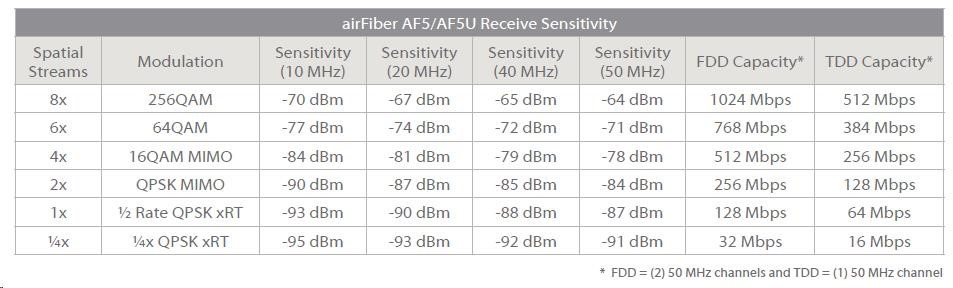 Technické specifikace: Dimensions 938.4 x 468.4 x 281.4 mm Weight 16 kg (Mount included) Max. Power Consumption 40 W Power Supply 50V, 1.2A PoE GigE Adapter (Included) Power Method Passive Power over Ethernet (42-58VDC) Certifications CE, FCC, IC Mounting Pole Mount Kit (Included) Wind Loading 194 lbf @ 125 mph Wind Survivability 125 mph Operating Temperature -40 to 55°C LEDs (12) Status LEDs: Data Port Link/Activity Data Port Speed Management Port Link/Activity Management Port Speed GPS Synchronization Master/Slave Link Status Modulation Mode 0.25x to 4x, 6x, 8x, Overload Remote and Local Displays (Calibrated Signal Strength) Interface Data Port (1) 10/100/1000 Ethernet Port Management Port (1) 10/100 Ethernet Port Auxiliary Port (1) RJ-12, Alignment Tone Port System Maximum Throughput 1.0+ Gbps Maximum Range 100+ km (Dependent on Regulatory Region) Packets per Second 1+ Million Encryption 128-Bit AES Forward Error Correction 164/205 Cyclic Prefix 1/16 Fixed Uplink/Downlink Ratio 50% Fixed Radio Frame Synchronization GPS Dynamic Frequency Selection -------------------------------------------------------------------- airFiber AF5/AF5U Receive Sensitivity Spatial Streams Modulation Sensitivity FDD Capacity* TDD Capacity* 8x 256QAM -65 dBm 1024 Mbps 512 Mbps 6x 64QAM -72 dBm 768 Mbps 384 Mbps 4x 16QAM MIMO -77 dBm 512 Mbps 256 Mbps 2x QPSK MIMO -83 dBm 256 Mbps 128 Mbps 1x 1 Rate QPSK xRT -87 dBm 128 Mbps 64 Mbps 1x 1x QPSK xRT -90 dBm 32 Mbps 16 Mbps * FDD = (2) 50 MHz channels and TDD = (1) 50 MHz channel