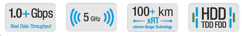 Současně nejvyspělejší technologie páteřního spoje v pásmu 5 GHz. Díky pokročilým technologiím HDD, eXtended Range, modulaci 256QAM komunikuje rychlostí až 1 Gbps. Spoj je možné realizovat do vzdálenosti 100km dle nastaveného výkonu. Pro kompletní spoj je třeba zakoupit dvě jednotky.