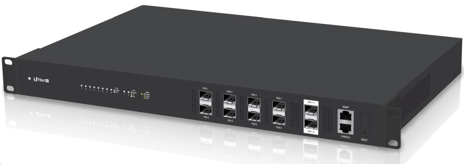 UFiber OLT nabízí 8 GPON portů a podporuje až 128 klientů na port, celkově až 1024 souběžných klientů s fyzickými linkami do vzdálenosti 20 km.