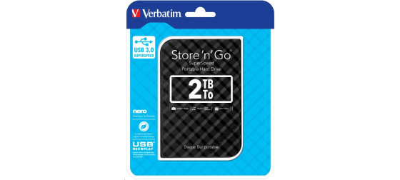 VERBATIM HDD 2.5" 2TB Store 'n' Go Portable Hard Drive USB 3.0, Black Special Features: Colours available: Black, Silver, White, Red & Blue Capacities available: 500GB, 1TB & 2TB High speed, high capacity storage. A fast & safe solution to expand storage or backup files USB 3.0 SuperSpeed - for ultra fast data transfer Nero Backup Software Energy Saving Software USB REC & PLAY* - supports USB recording/ playback 2 year limited warranty** System requirements: PC or Mac with USB 3.0 Windows XP / Vista / Windows 7 & 8 Mac OS X 10.4 or higher Pack Contents: Portable Hard Drive / USB 3.0 Cable / Nero Backup Software / Green Button Energy Saving Software / Verbatim Formatter / Quick Start Guide / User Guide (pre-loaded on the drive). Verbatim GmbH, Hugenottenstraße 9 63263 Neu-Isenburg Německo, support@verbatim.com
