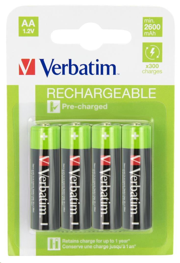 Produkt:Baterie; Typ baterie:Nabíjecí; Velikost článku:Tužková; Kapacita (mAh):2600; Typ článku:Alkalický; Obsah balení:4. Verbatim GmbH, Hugenottenstraße 9 63263 Neu-Isenburg Německo, support@verbatim.com