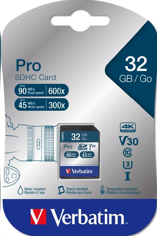 Verbatim Pro U3 Micro SDHC/SDXC Cards Verbatim Pro memory cards give Pro level performance to advanced cameras and HD camcorders. UHS Speed Class 3 (U3) rating means you can capture 4k ultra HD and Full HD video then transfer quickly to your computer for viewing and editing. Compatible with any device with an SDHC/SDXC* memory card slot. Read Speed: up to 90MB/Sec.** Write Speed: up to 45MB/Sec.** Suitable for 4k ultra HD video capture *SDXC compatible host device required **UHS-1 compatible device required, actual performance may vary depending on host device, interface & usage conditions Product Dimensions: 32mm x 24mm x 2.1mm Product weight: 1.8 grams Capacity: 32GB System requirements: Compatible with cameras and SDHC or SDXC supporting host devices. Verbatim GmbH, Hugenottenstraße 9 63263 Neu-Isenburg Německo, support@verbatim.com