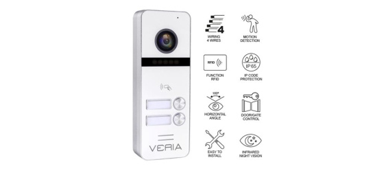 Vstupní kamerova jednotka VERIA 302 je vhodná k propojení s monitory VERIA řady 3xxx. Kamerová jednotka snímá obraz ve Full HD rozlišení, pro noční přísvit používá IR LED diody a pro kvalitní obraz IR Cut filtr. Vstupní stanice disponuje vestavěnou čtečkou RFID čipů 13,56 MHz. Propojení mezi monitorem a vstupní stanicí je 4-vodičové.