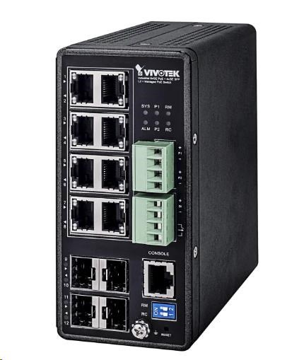 Popis Vivotek AW-IHT-1271, Industriální switch 8xGbe POE (budget 240W, 802.3af/at) + 4x SFP, management L2+,