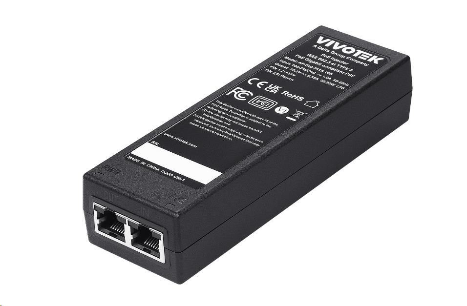Popis Vivotek vnitřní gigabit injektor PoE napájení (802.3af/at), 30W, ochrana proti přepětí, MTBF 200k hodin