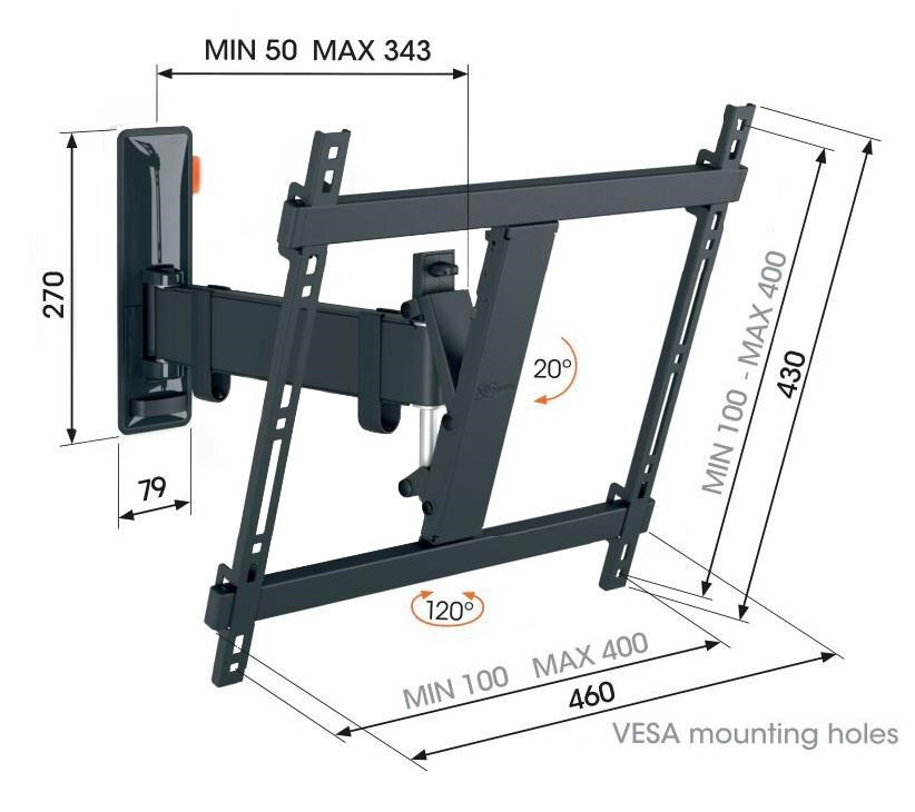 TV 32-65", natáčení 120°, náklon 20°, hloubka 50-343 mm, VESA do 400x400, 25 kg.Více