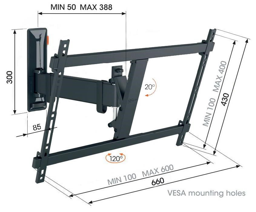 TV 40-77", natáčení 120°, náklon 20°, hloubka 50-388 mm, VESA do 600x400, 35 kg.Více
