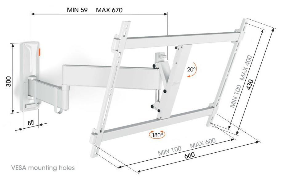 S tímto stylovým nástěnným držákem řady COMFORT Full-Motion+ si můžete sledování svého velkého televizoru maximálně užít. TV 3643 se může otáčet až o 180° a naklánět až o 20° pro optimální pohodlí při sledování. Je navržen pro intenzivní používání, takže je ideální pro rodiny s dětmi. Váš televizor bude zaručeně bezpečně a spolehlivě upevněn. Držák je vhodný pro televizory s úhlopříčkou 40 až 77 palců a hmotností do 35 kg.