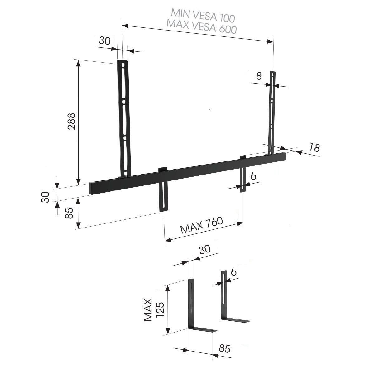 SOUND 3550 se snadno upraví pro uchycení soundbarů různých velikostí a tvarů. Nezáleží, zda mají otvory pro uchycení na zadní nebo spodní straně. Je vyroben z z kvalitní oceli a hliníku z prémiovou povrchovou úpravou.