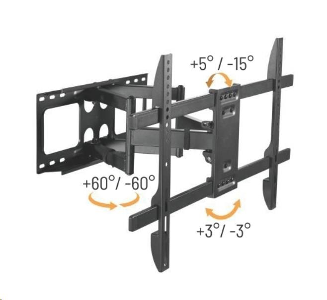 Výsuvný nástěnný držák LPA69-466 je určen pro instalaci TV s plochou obrazovkou s úhlopříčkami od 37“ do 80“. Jeho největší přednostní je robustní výsuvná heavy-duty konstrukce, díky níž unese TV o hmotnosti až 60 kg a zároveň umožňuje nastavit vzdálenost TV od stěny v rozsahu 58 mm až 402 mm, samozřejmostí je pak také velký rozsah polohování. Držák umožňuje snadné naklápění TV v rozsahu +5°~-15°, natočení do stran v rozsahu +60°~-60° a rotaci v rozsahu +3°~-3°, což maximalizuje flexibilitu sledování z libovolného místa v místnosti. Integrovaná svorka na kabely udržuje kabely uspořádané a chráněné.