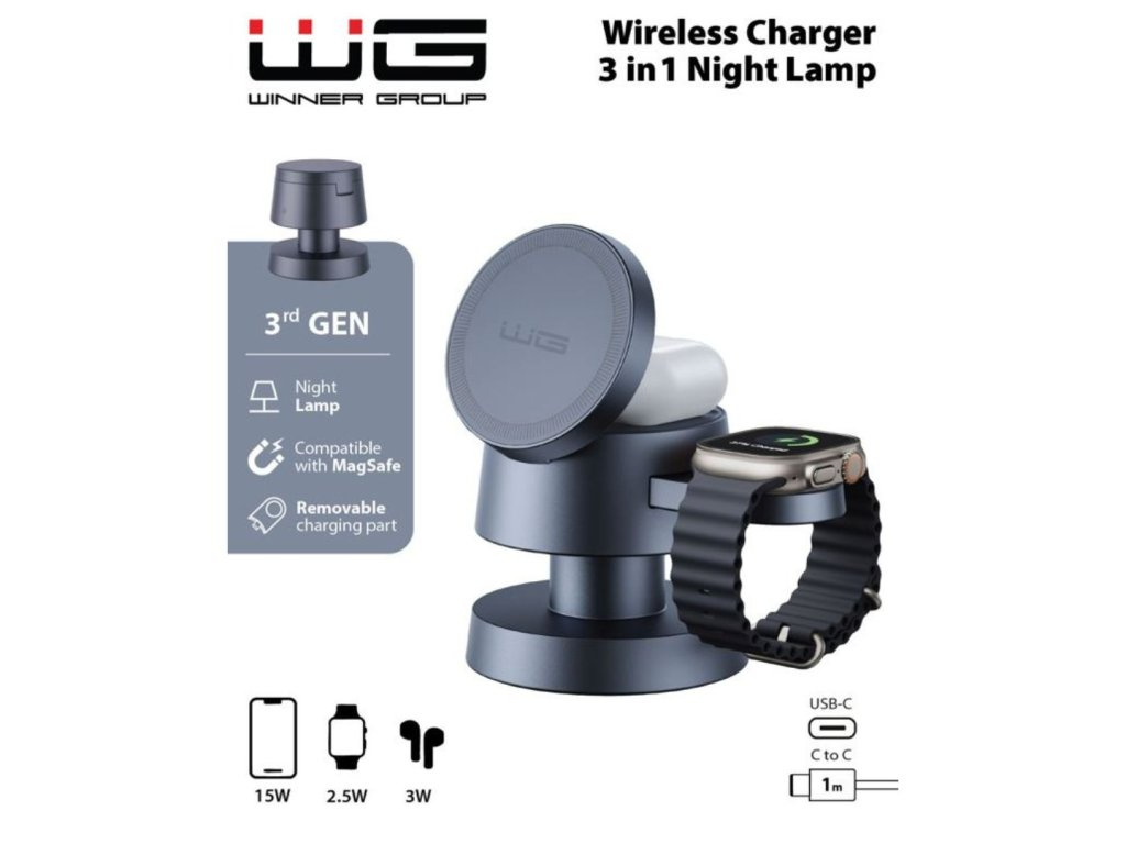 Tato elegantní 3v1 bezdrátová nabíječka s vestavěnou LED lampičkou je ideálním řešením pro moderní domácnosti a kanceláře. Nabízí rychlé a bezpečné bezdrátové nabíjení tří zařízení současně – iPhone, Apple Watch a bezdrátová sluchátka nebo Android telefon. Stylový a funkční design zaručí, že se stane nepostradatelnou součástí vašeho pracovního stolu nebo nočního stolku.