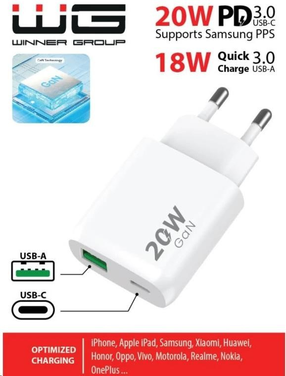 Síťová nabíječka GaN 20W je kompaktní, výkonná a odolná proti přehřívání. Díky duálnímu výstupu USB-C a USB-A nabízí široké možnosti využití pro smartphony, tablety i další elektroniku.