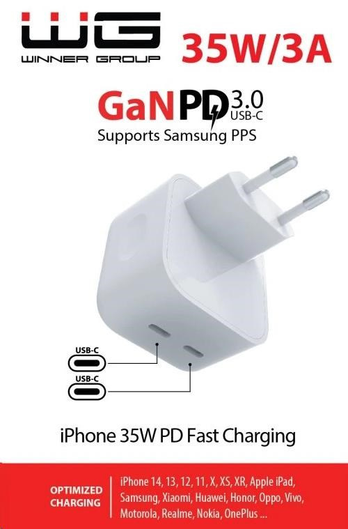 Síťová nabíječka GaN 35W je kompaktní, výkonná a odolná proti přehřívání. Díky duálnímu výstupu USB-C a USB-A nabízí široké možnosti využití pro smartphony, tablety i další elektroniku.