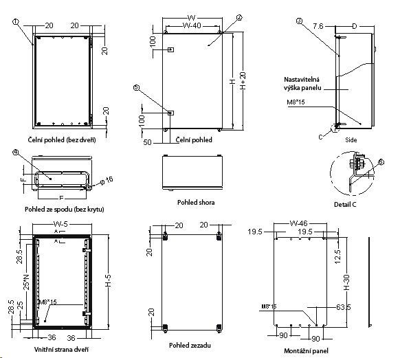 Univerzální rozvaděč, IP66, ocelový, šedý. Třívrstvá povrchová úprava (fosfátování, máčení v základním laku, práškový lak), zaměnitelné dveře, pevná konstrukce. Odnímatelný kryt kabelového průchodu. Rozvaděč je vyroben z válcované oceli o tloušťce 1,5 mm. Standardy: IEC60529, EN60529/10.91, GB4208-93 Provedení: dveře - plné, otevíratelné o 110 stupňů, montáž pravá nebo levá (uživatelsky zaměnitelné otevírání) zádní kryt - plný boční kryt - plný horní kryt - plný montážní deska: