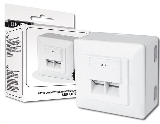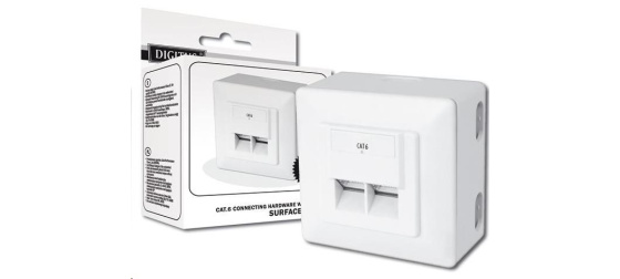 Zásuvka 2xRJ45 na omítku, STP Cat6- CAT 6- šířka pásma až 300Mhz- šikmý vývod- narážecí svorky- stíněná- na omítku (není třeba krabičky)- certifikace EIA TIA 568 and ISO IEC 11801/EN 50173- barva slonové kosti/bílá