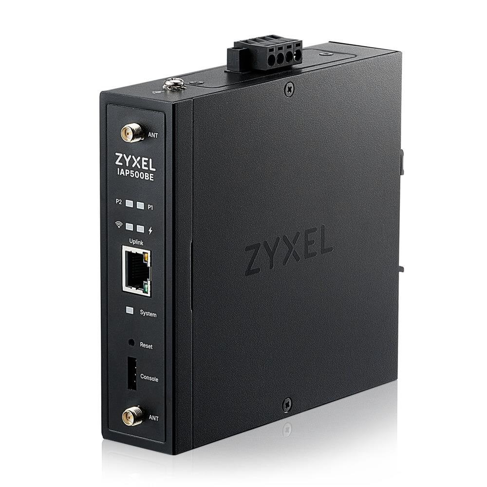 Zyxel IAP500BE, BE5000, Dual Radio 2x2 MU-MIMO, PoE+ (802.3at), Industrial AP, DIN Rail mounted Standalone/Nebula Cloud Managed, DC Power Wireless ________________________________________ Standard IEEE802.11 be/ax/ac/n/g/b/a MIMO MU-MIMO Wireless speed 2.4GHz: 688Mbps 5GHz: 4324Mbps Frequency band 2.4GHz: USA (FCC): 2.412 to 2.462 GHz Europe (ETSI): 2.412 to 2.472 GHz 5GHz: USA (FCC): 5.15 to 5.35 GHz; 5.470 to 5.850 GHz European (ETSI): 5.15 to 5.35 GHz; 5.470 to 5.725 GHz Bandwidth 20-, 40- ,80-, 160- and 240-MHz Conducted typical transmit output power*1 US (2.4GHz/5GHz): 25/26dBm EU (2.4GHz/5GHz): 16/26dBm RF Design ________________________________________ Antenna type External Antenna Antenna gain 2.4GHz: 2 dBi, 2x2:2SS 5GHz: 3 dBi, 2x2:2SS Minimum receive sensitivity Min. Rx sensitivity up to -99 dBm WLAN Features ________________________________________ Band steering Yes WDS/Smart Mesh*2 Yes Wireless Bridge Yes Fast roaming Pre-authentication, PMK caching and 802.11r/k/v DCS Yes Load balancing Yes Advanced cellular coexistence Yes Security ________________________________________ Encryption WEP WPA WPA2 WPA3 Authentication IEEE 802.1X/ RADIUS authentication Access management L2-isolation MAC filtering Rogue AP detection Networking ________________________________________ IPv6 Yes VLANs Yes WMM Yes U-APSD Yes Management ________________________________________ Operating mode Nebula cloud-managed Controller-managed Standalone Web UI/CLI Yes SNMP Yes Physical Specifications ________________________________________ Item Dimensions (WxDxH)(mm/in.) 125 x 130 x 35 / 4.92 x 5.12 x 1.38 (without Antenna) Weight (g/lb.) 646 / 1.42 Packing Dimensions (WxDxH)(mm/in.) 160 x 180 x 50 / 6.30 x 7.09 x 1.96 Weight (g/lb.) 864 / 1.90 Included accessories Din rail mount Two 2.4GHz/5GHz detachable antennas MTBF (hr) 631,165 Physical Interfaces ________________________________________ Ethernet port 1 x 1/2.5GbE LAN Power PoE (802.3at): power draw 24W DC input: 12V-48V redundant dual input PoE modes IEEE 802.3af: Not supported IEEE 802.3at: Unrestricted IEEE 802.3bt: Unrestricted Environmental Specifications ________________________________________ Operating Temperature -25°C to 65°C/-13°F to 149°F Humidity 10% to 90% (non-condensing) Storage Temperature -40°C to 70°C / -40°F to 158°F Humidity 10% to 90% (non-condensing) Certifications ________________________________________ Radio FCC Part 15C FCC Part 15E FCC Part 2.1091 ETSI EN 300 328 EN 301 893 Draft EN 303 687 EN 50385 EN 50665 EN IEC 62311 LP0002 EMC FCC Part 15B EN 301 489-1 EN 301 489-17 EN55032 EN55035 EN61000-3-2/-3 EN60601-1-2 BSMI CNS15936 Safety EN 62368-1 IEC 62368-1 BSMI CNS15598-1.